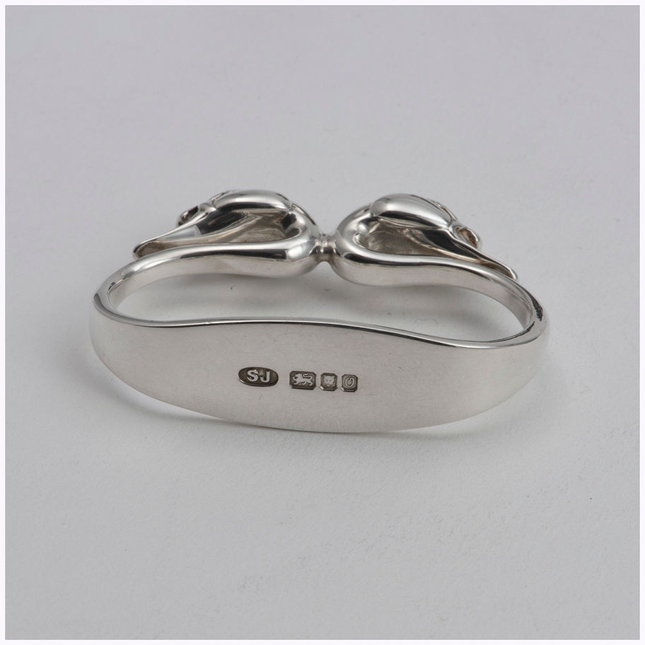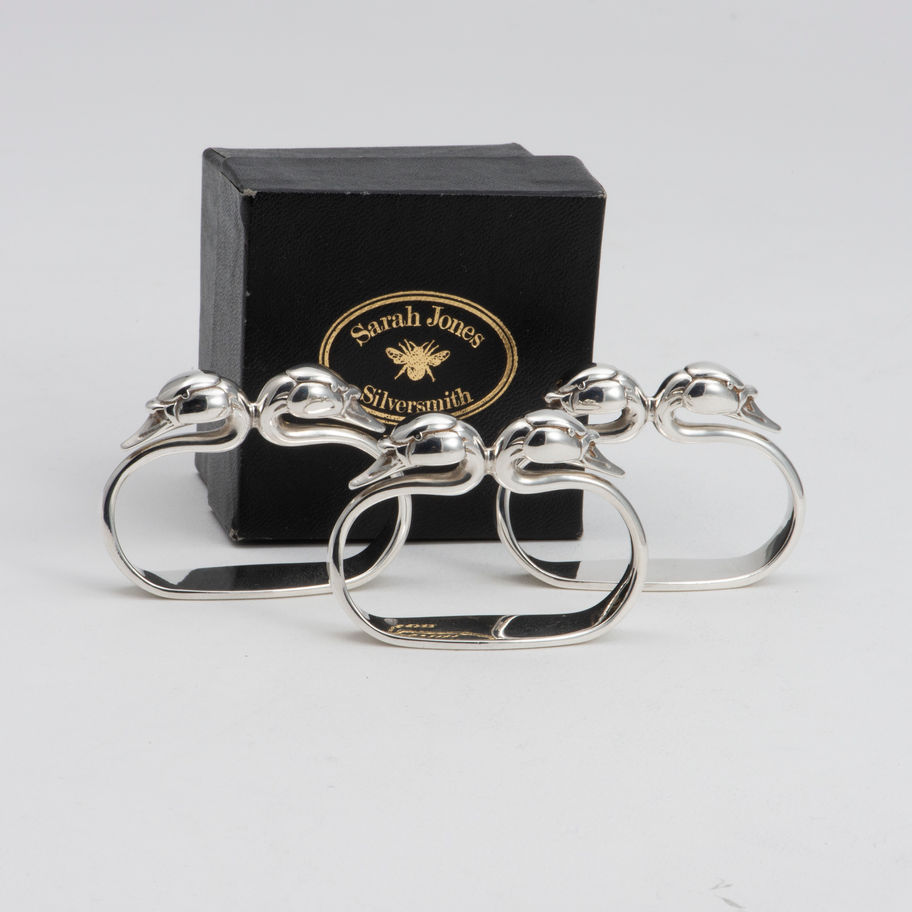 Sarah Jones. \nThree 20th century silver Napkin Rings with double Swan's heads, London 1988. Housed in a Sarah Jones retailer's box. Condition: \n